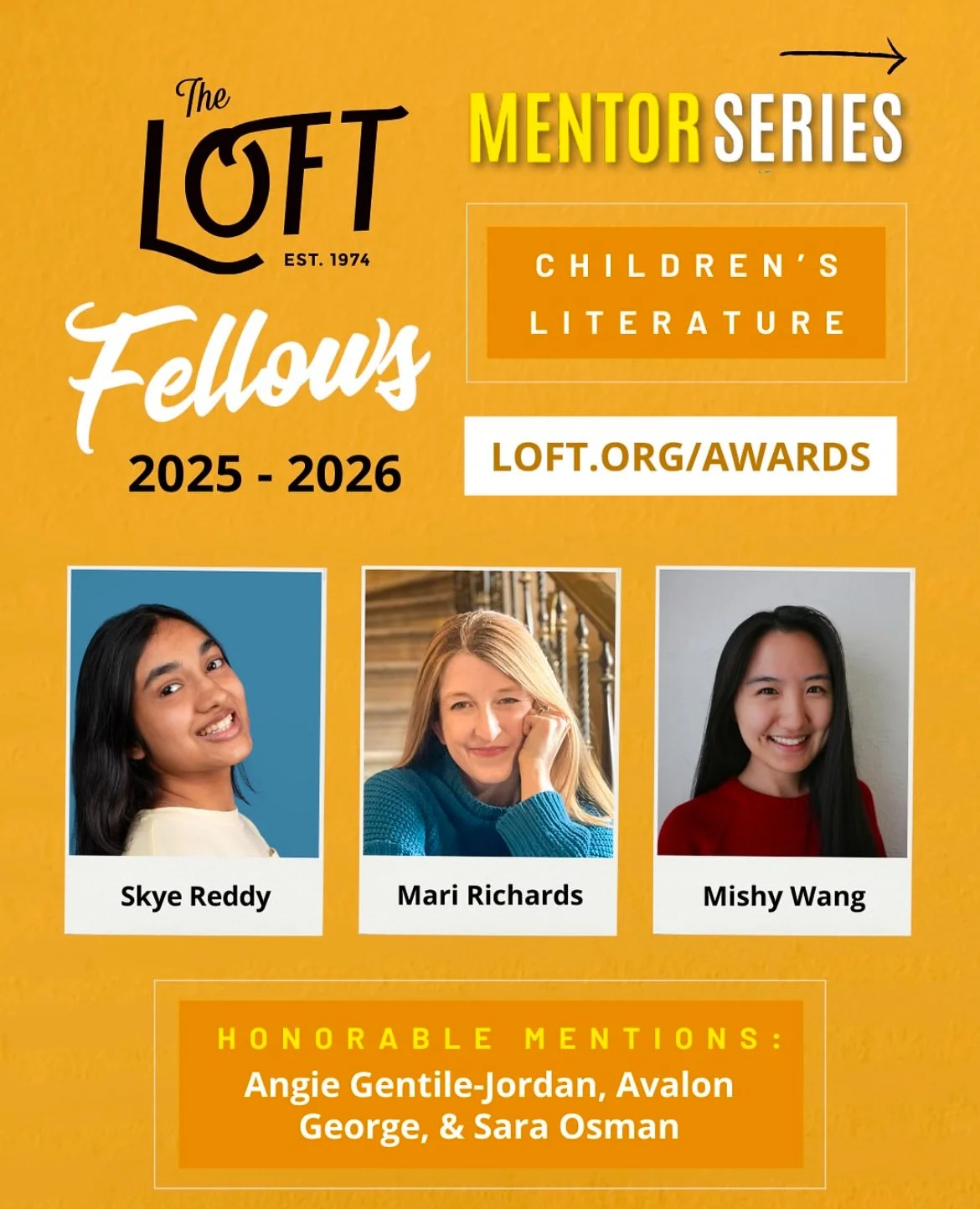 I am so honored and slightly stunned to be able to say I am now a Fellow! The Loft Literary Center is a well-respected literary hub in Minneapolis with amazing programming, classes, and other supports. I’m a children’s literature fellow in their mentorship program: the 2025–2026 Loft Mentor Series Fellowship in Poetry and Creative Prose, It’s a cross-genre community of twelve fellows in fiction, creative non-fiction, poetry, and children’s lit and everyone is so creative and thoughtful. We meet monthly through potlucks, seminars, and small groups with our incredible guest mentors. Plus a few public readings and general support. I can’t wait to see what’s in store over the next 16 months or so!